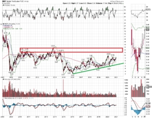 MBT, you’ll likely find you’re already profitable on if you go back and include the huge dividends its paid out through the years. Also, you may not have averaged down on its dips. That would have been to your advantage. It’s trending higher. The red resistance zone is where it may have trouble getting above. Since you didn’t ask on the forum but after a regular article post, it won’t let me post more charts within this post. I’ll have to make another post. I’d encourage you to post questions on the Members Forum.